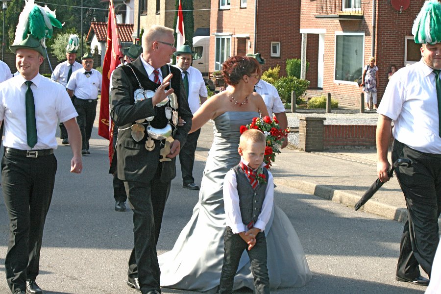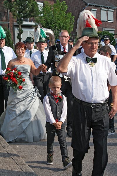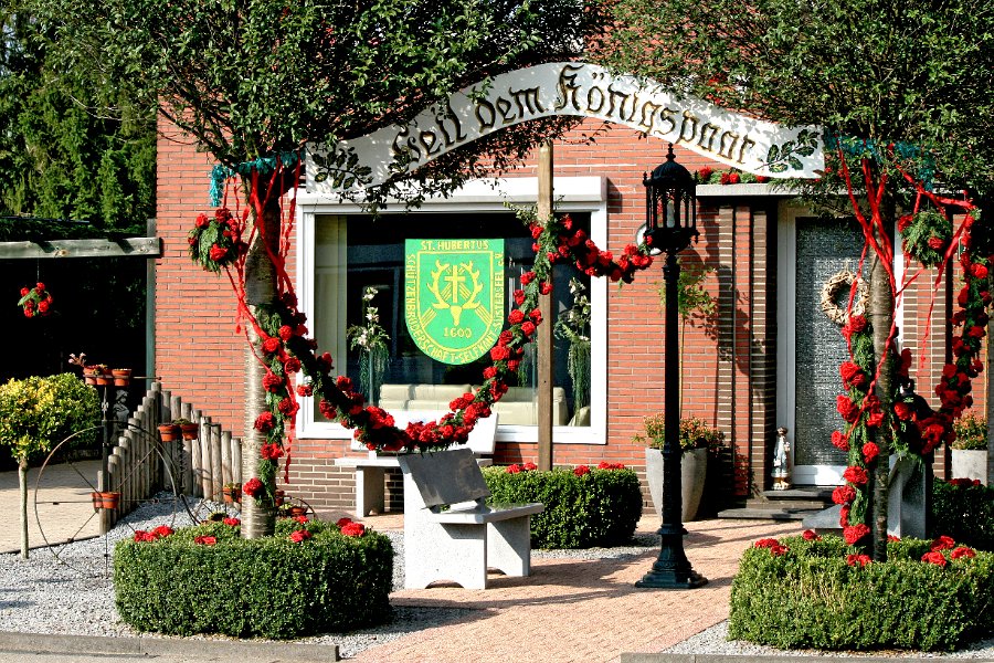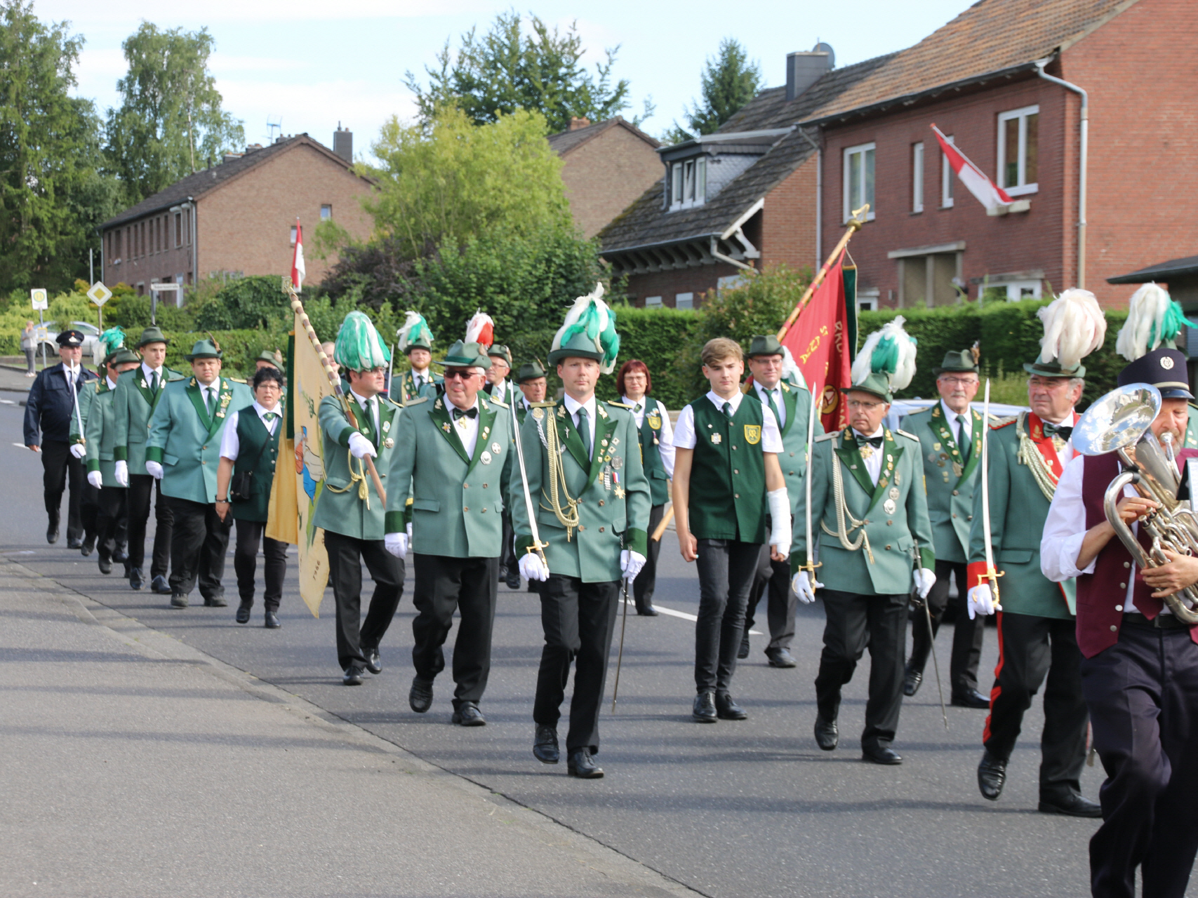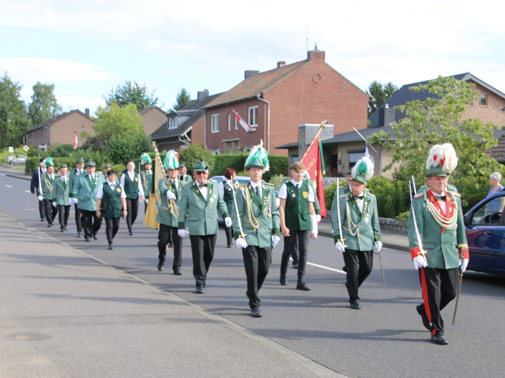 Die St. Hubertus Schützenbruderschaft und die Ortsbewohner feierten drei Tage die Anna-Kirmes. Am Samstag startete bei sommerlichen Temperaturen der Aufzug durch das Neudorf, auch bekannt als die Westerheide. Das Königspaar Math und Nicole Verheijen und ihre Adjutantinnen Myrna Verheijen und Nadia Heiligers stellten sich der Ortsbevölkerung vor. Dabei waren auch in Vertretung des Präses Pfarrer Roland Bohnen Pastor José Kallupilankal, der Dekanatsjugendprinz Nico Dahlmanns und Schülerprinz André Plum. Als Überraschung für den Schützenkönig waren zwei befreundete und in schmucken Uniformen gekleidete Bruderschaften im Aufzug, die St. Jan Schützenbruderschaft aus Nieuwstadt und die Stadtschötterij aus Sittard.